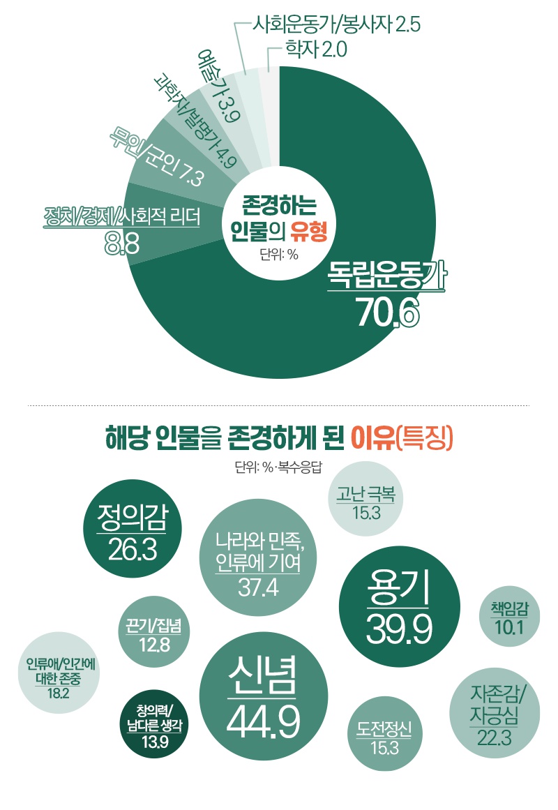 신념(44.9%)과 용기(39.9%), 나라와 민족, 인류에 기여(37.4%) 항목이 특히 많은 선택을 받았습니다.