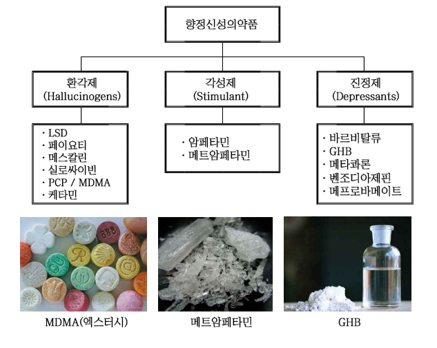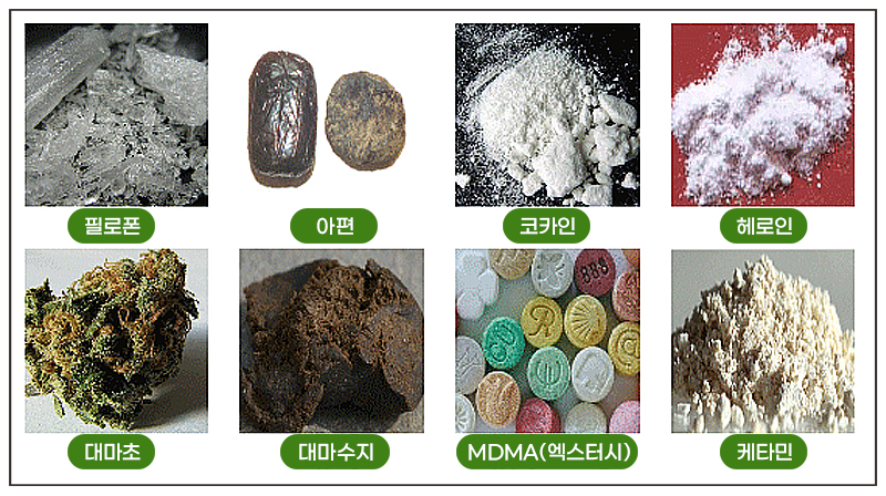 정신에 영향을 주는 물질을 말하며, 생산, 판매, 사용이 금지된 약물(illicit drugs)을 지칭.