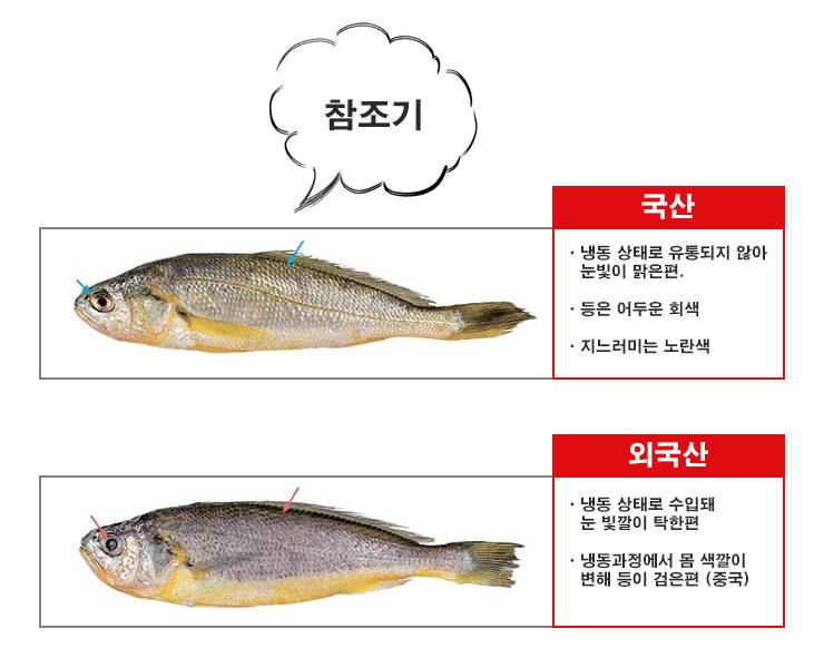 같은 참조기라도 중국산은 냉동 상태로 수입되기 때문에 등 색깔이 국산이 비해 검은빛을 더 띕니다.
