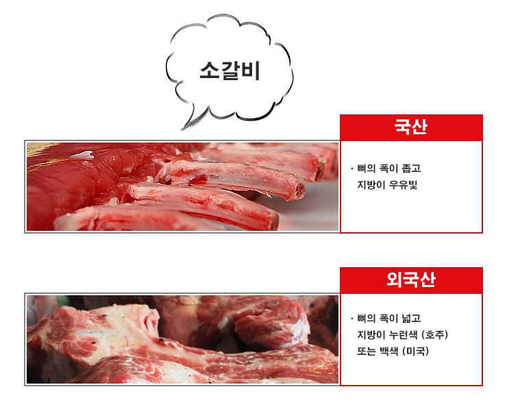 ㆍ 소갈비 뼈 폭 좁고 가늘면 국산, 넓고 굵으면 수입산