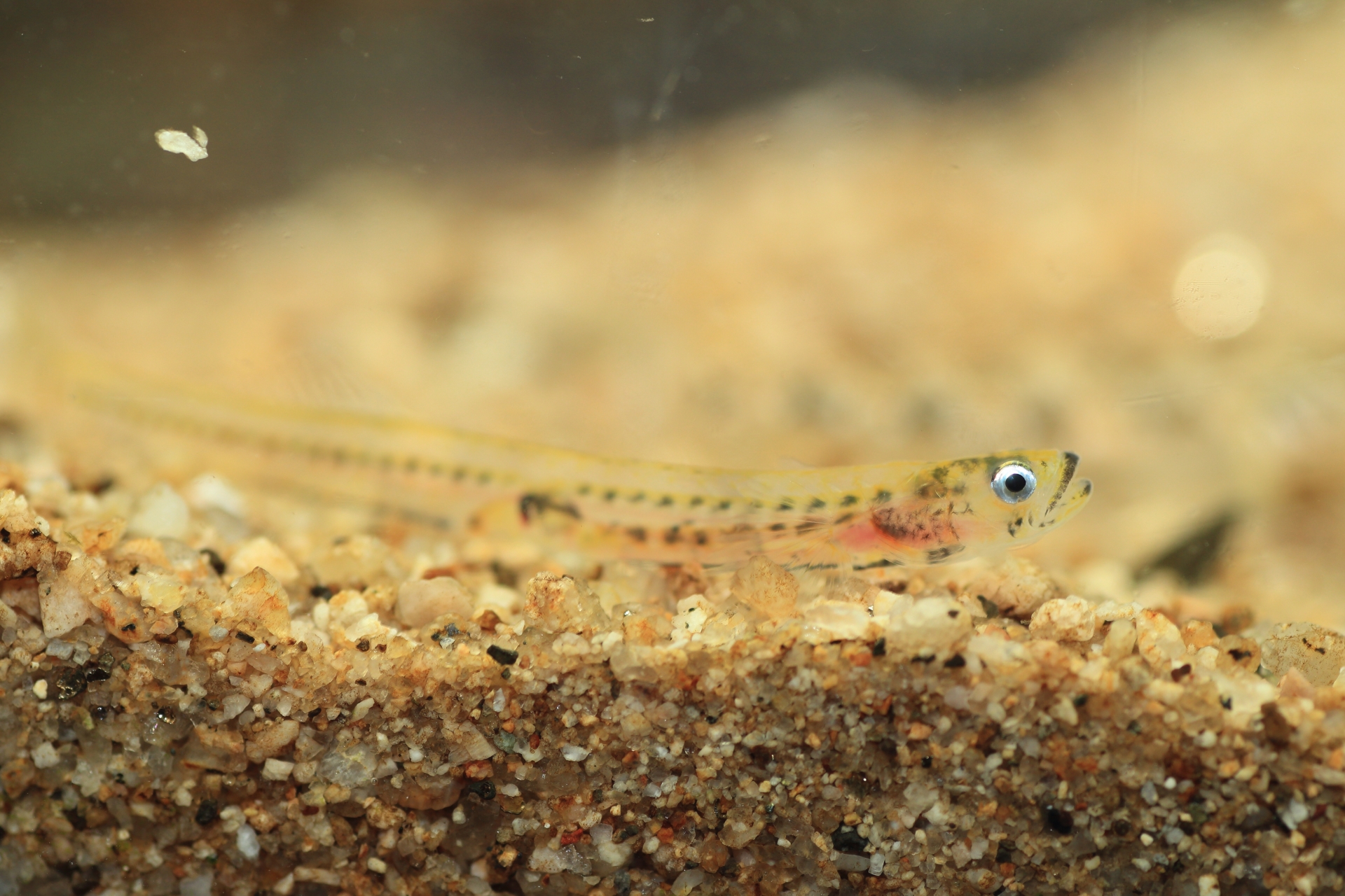 눈이 검고, 배부분과 꼬리지느러미 부근에 몇 개의 검은 점이 있지만 전체 몸은 투명합니다.