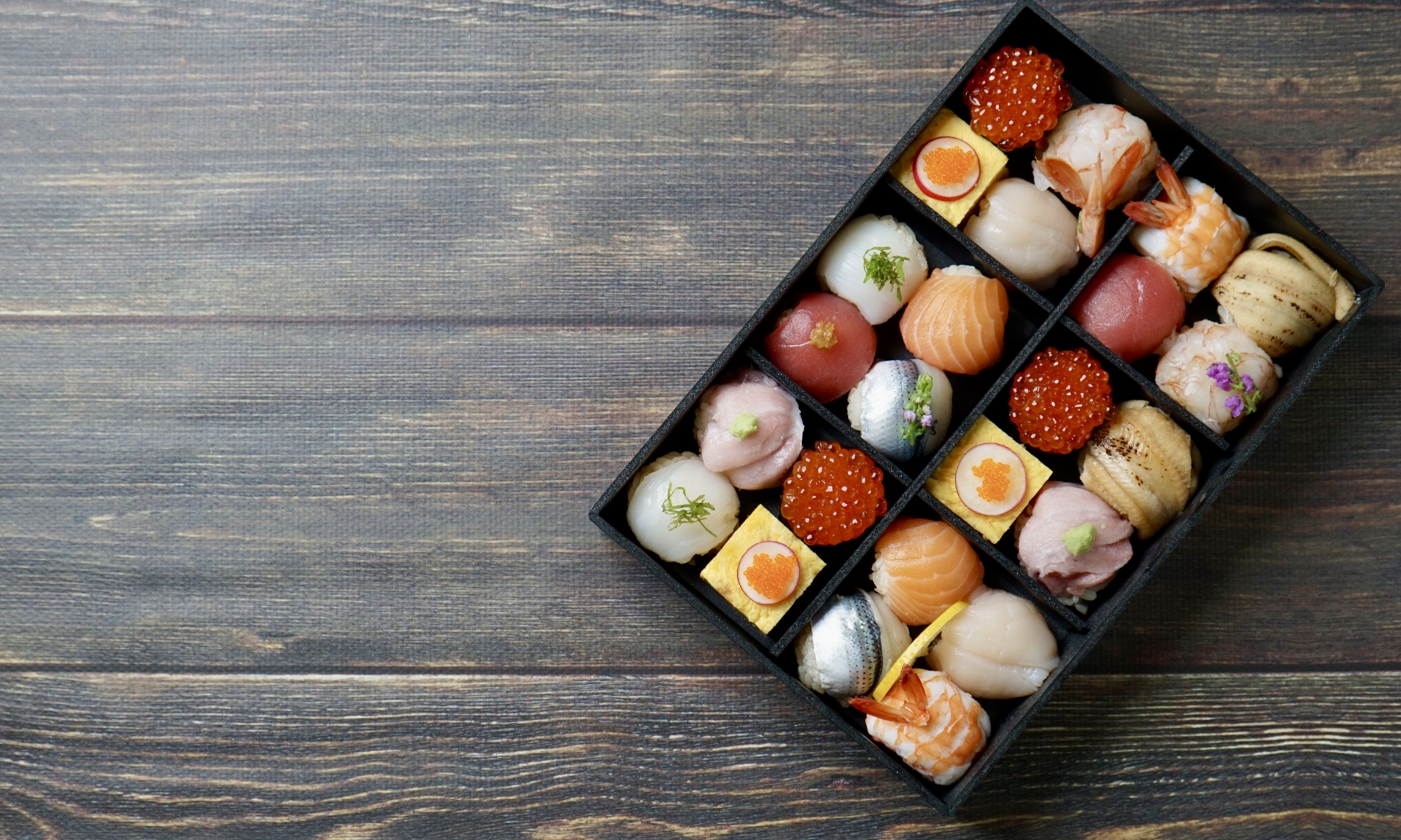종류는 주방장의 재량으로 하는 음식인 점에서 정해진 재료가 특별히 있는 것은 아니지만, 보통 광어, 참치, 전복(내장), 성게알 등이 인기있는 재료이고 숙성정도에 따라 평가가 극명히 달라지기 때문에 당일 수산시장에서 계절등에 따라 납품되는 신선한 재료위주로 만듭니다. 때문에 노르웨이 연어가 나오는 일은 거의 없습니다.