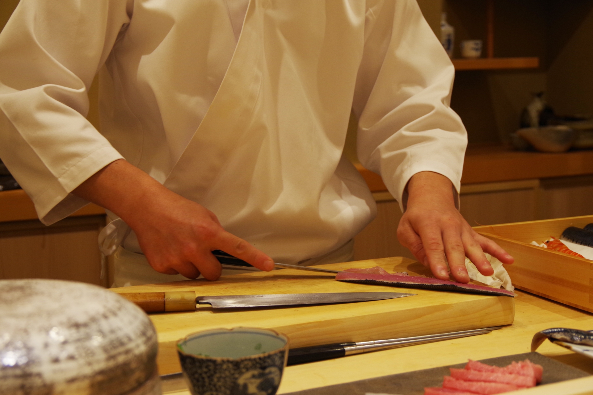 정해진 손님을 받아 일정 부분만 제공하는 만큼 속도 및 손님 개개인의 취향을 기억해야하고 즉석에서 스시를 내어주며 어느 정도 설명을 해주어야 합니다.