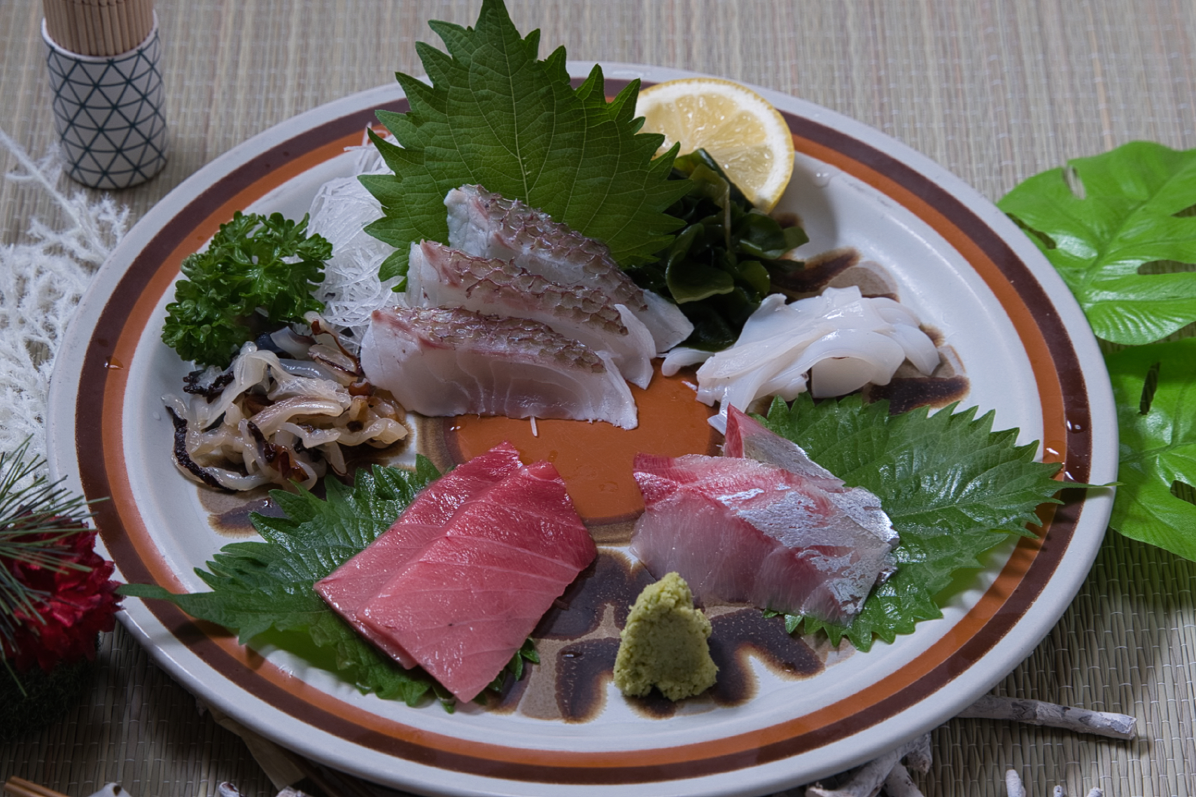 종류는 주방장의 재량으로 하는 음식인 점에서 정해진 재료가 특별히 있는 것은 아니지만, 보통 광어, 참치, 전복(내장), 성게알 등이 인기있는 재료이고 숙성정도에 따라 평가가 극명히 달라지기 때문에 당일 수산시장에서 계절등에 따라 납품되는 신선한 재료위주로 만듭니다. 때문에 노르웨이 연어가 나오는 일은 거의 없습니다.